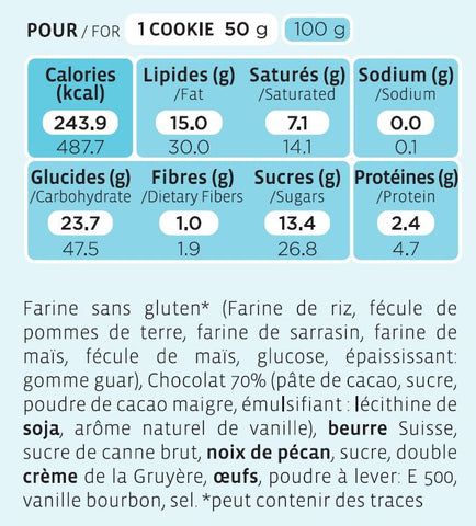 Gluten-free flour* (rice flour, potato starch, buckwheat flour, corn flour, corn starch, glucose, thickener: guar gum), 70% chocolate (cocoa mass, sugar, low-fat cocoa powder, emulsifier: soy lecithin, natural vanilla flavor), Swiss butter, raw cane sugar, pecans, sugar, double cream from Gruyère, eggs, raising agent: E500, bourbon vanilla, salt. *may contain traces